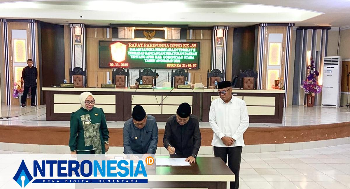 Anteronesia.id, Gorontalo Utara– Dewan Perwakilan Rakyat Daerah (DPRD) Kabupaten Gorontalo Utara melalui Rapat Paripurna menyepakati Rancangan Peraturan Daerah (Ranperda) tentang Anggaran Pendapatan dan Belanja Daerah (APBD) Tahun Anggaran 2026 untuk dijadikan Peraturan Daerah. Kesepakatan ini dicapai setelah Badan Anggaran (Banggar) DPRD menyelesaikan pembahasan bersama Tim Anggaran Pemerintah Daerah (TAPD).
