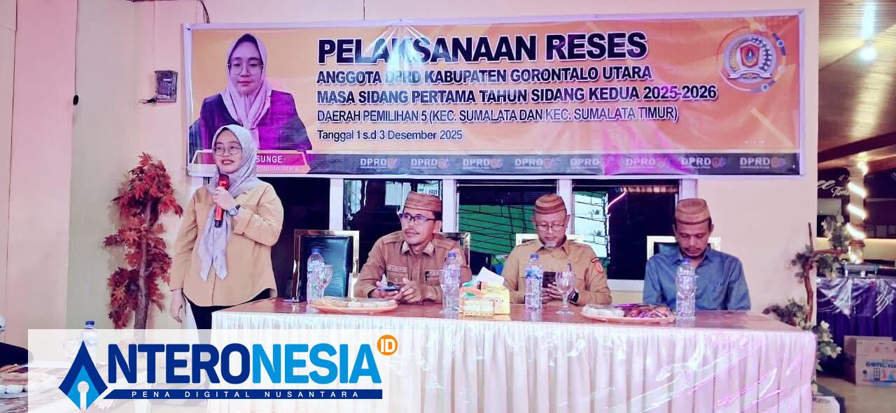 Anteronesia.id, Gorontalo Utara– Anggota DPRD Kabupaten Gorontalo Utara (Gorut) dari Fraksi Hanura-PKS, Evelin K. Sunge, menerima berbagai aspirasi masyarakat dalam reses masa sidang pertama tahun sidang 2025–2026 di daerah pemilihannya, khususnya dari masyarakat Desa Bolontio Timur, Kecamatan Sumalata. (2-12).