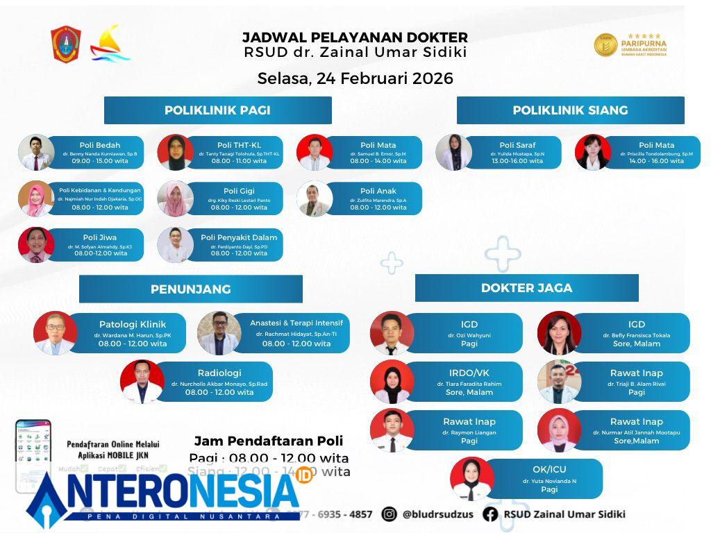 Anteronesia.id, Gorontalo Utara– Rumah Sakit Umum Daerah (RSUD) dr. Zainal Umar Sidiki (ZUS) kembali menegaskan komitmennya dalam memberikan kepastian layanan kesehatan bagi masyarakat Gorontalo Utara. Hal ini diwujudkan melalui rilis resmi jadwal pelayanan dokter yang berlaku mulai Selasa, 24 Februari 2026.