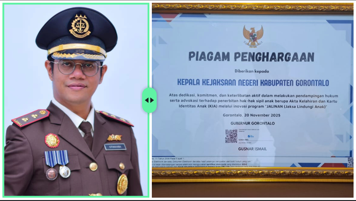 ANTERONESIA.ID, KABGOR – Program “Jago Abangku” yang digagas Kejaksaan Negeri (Kejari) Kabupaten Gorontalo kembali menorehkan prestasi dalam pelayanan hukum dan pemenuhan hak-hak sipil masyarakat. Inovasi ini mendapat apresiasi langsung dari Gubernur Gorontalo, Gusnar Ismail, yang menyerahkan Piagam Penghargaan kepada Kepala Kejari atas dedikasi dalam memperjuangkan hak-hak anak di daerah tersebut.