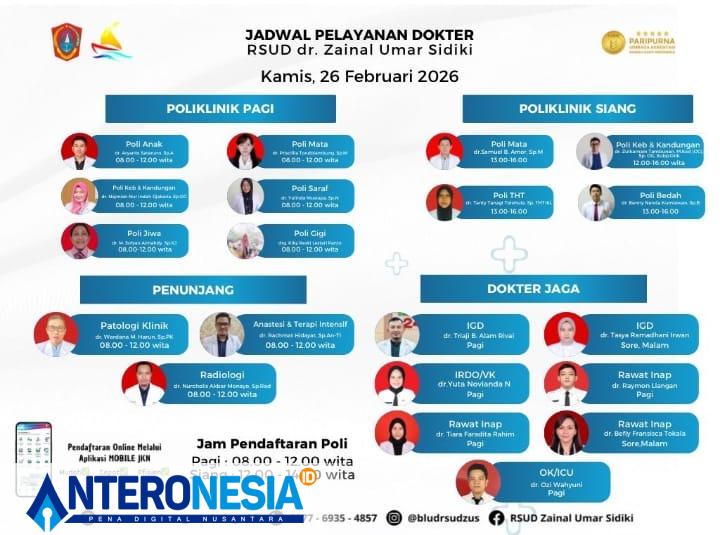 Anteronesia.id, Gorontalo Utara – Rumah Sakit Umum Daerah (RSUD) Zainal Umar Sidiki (ZUS) memastikan kelancaran pelayanan kesehatan di bulan Ramadhan, manajemen umumkan jadwal pelayanan untuk Kamis, 26 Februari 2026.