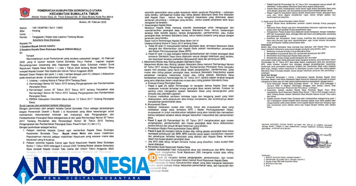 ANTERONESIA.ID GORUT – Pemerintah Kecamatan Sumalata Timur, Kabupaten Gorontalo Utara, telah mengeluarkan tanggapan resmi terkait laporan dugaan penyalahgunaan wewenang dalam mutasi jabatan Sekretaris Desa Dulukapa. Tanggapan ini disampaikan melalui surat bernomor 140/SUMTIM/3/II/2025 tertanggal 8 Februari 2025, yang ditujukan kepada Bapak David Hantu dan Kepala Desa Dulukapa, Bapak Irwan Moilo.