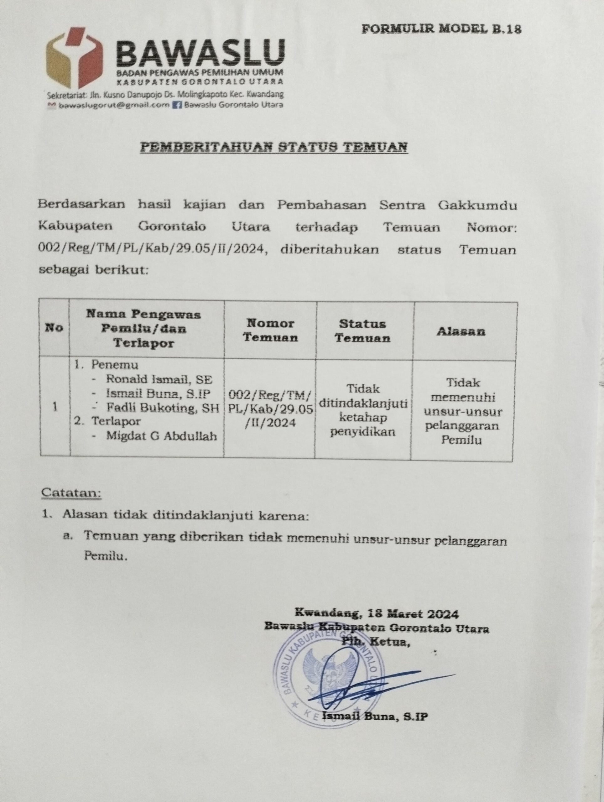 AnteroNesia.id, Gorontalo Utara – Badan Pengawasan Pemilu (Bawaslu) Gorontalo Utara menyatakan bahwa