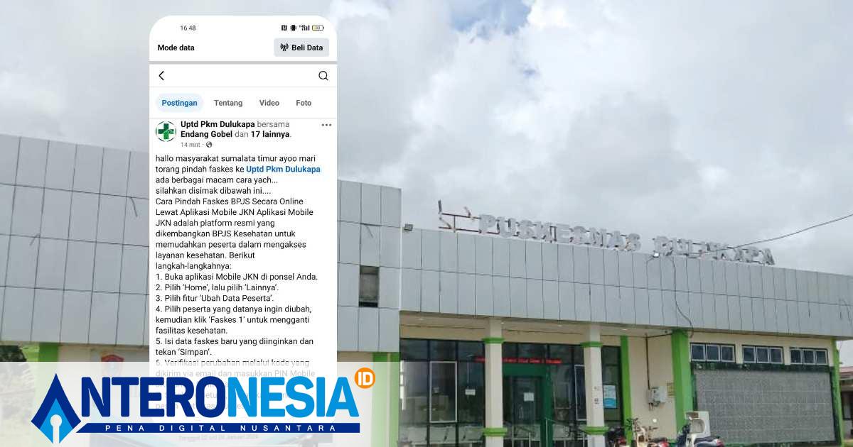 ANTERONESIA.ID GORONTALO UTARA – UPTD Puskesmas (PKM) Dulukapa mengajak masyarakat Kecamatan Sumalata Timur untuk memindahkan Fasilitas Kesehatan Tingkat Pertama (Faskes 1) ke UPTD PKM Dulukapa. Pengumuman ini disampaikan melalui akun resmi Facebook UPTD PKM Dulukapa. Jum’at, 7 Maret 2025.